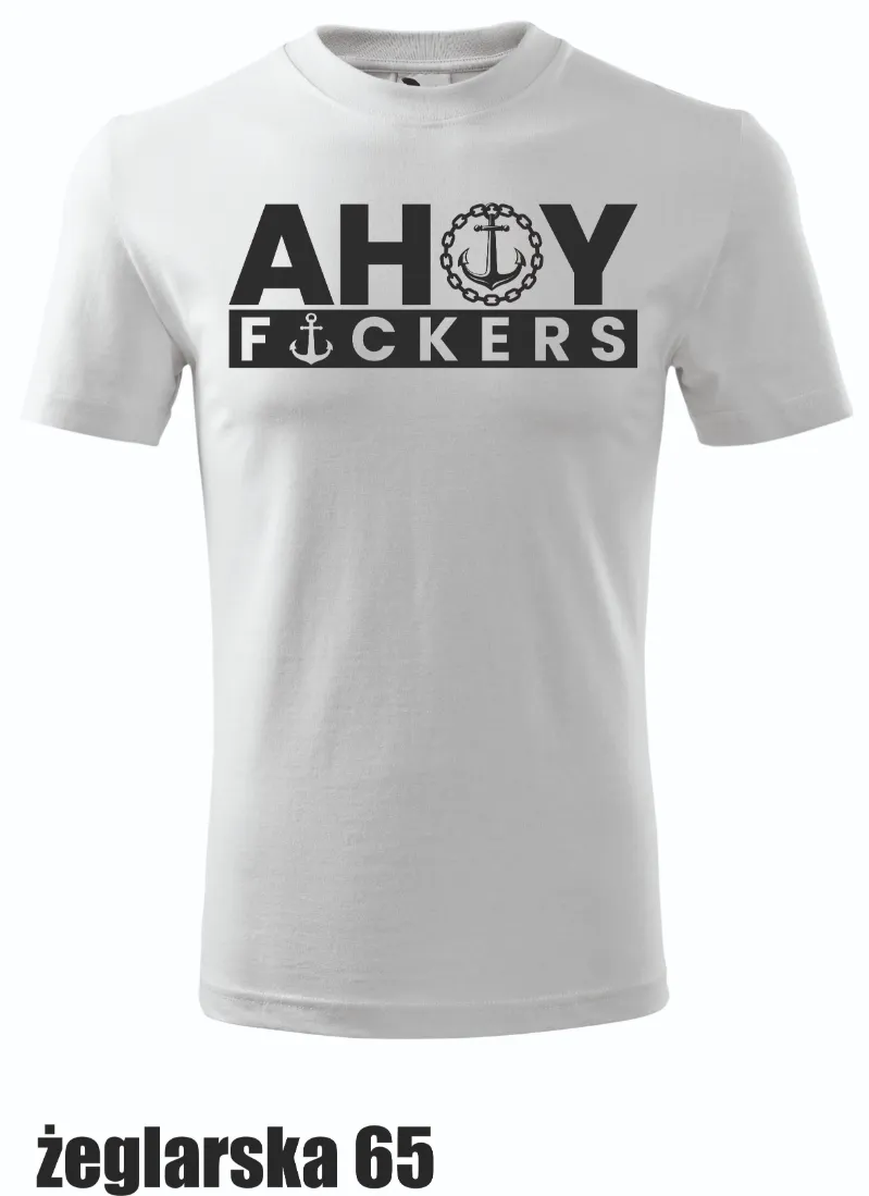 Koszulka w kolorze białym z nieco humorystycznym nadrukiem „Ahoy F*ckers” w czarnym kolorze. Dla osób z poczuciem humoru i dystansem do życia.