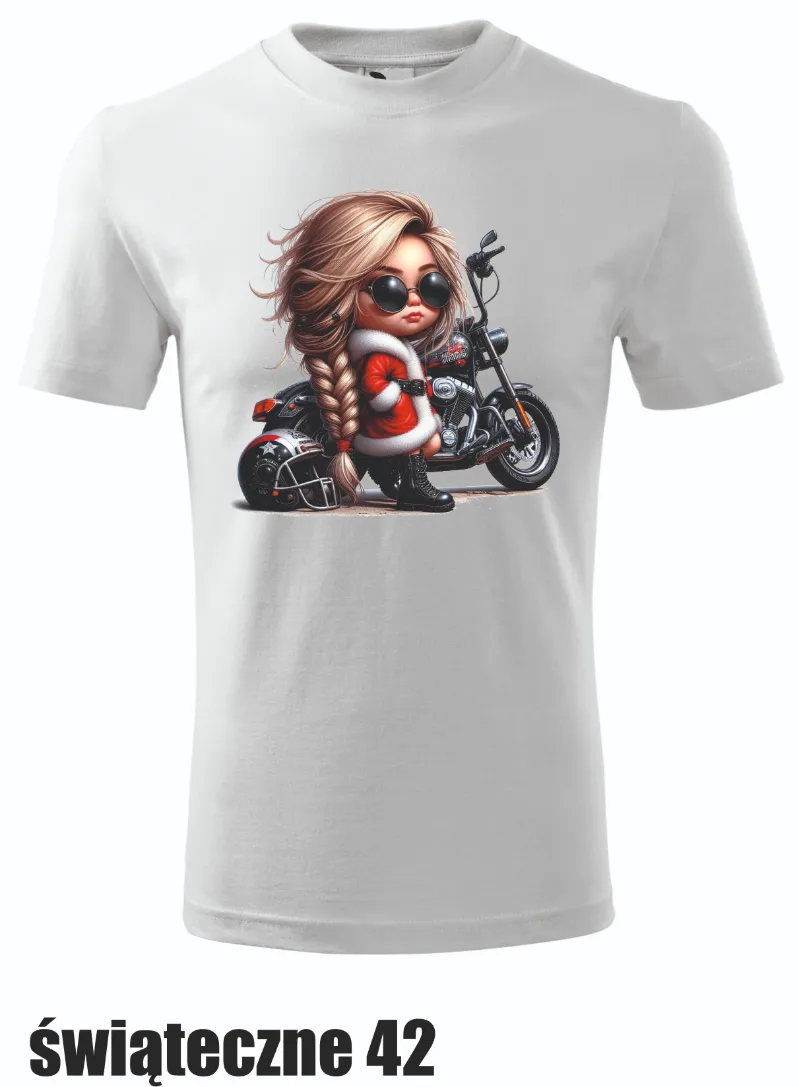 Koszulka z dziewczyną na tle motocykla i świątecznych detali. Stylowy wybór na święta dla fanów motoryzacji.