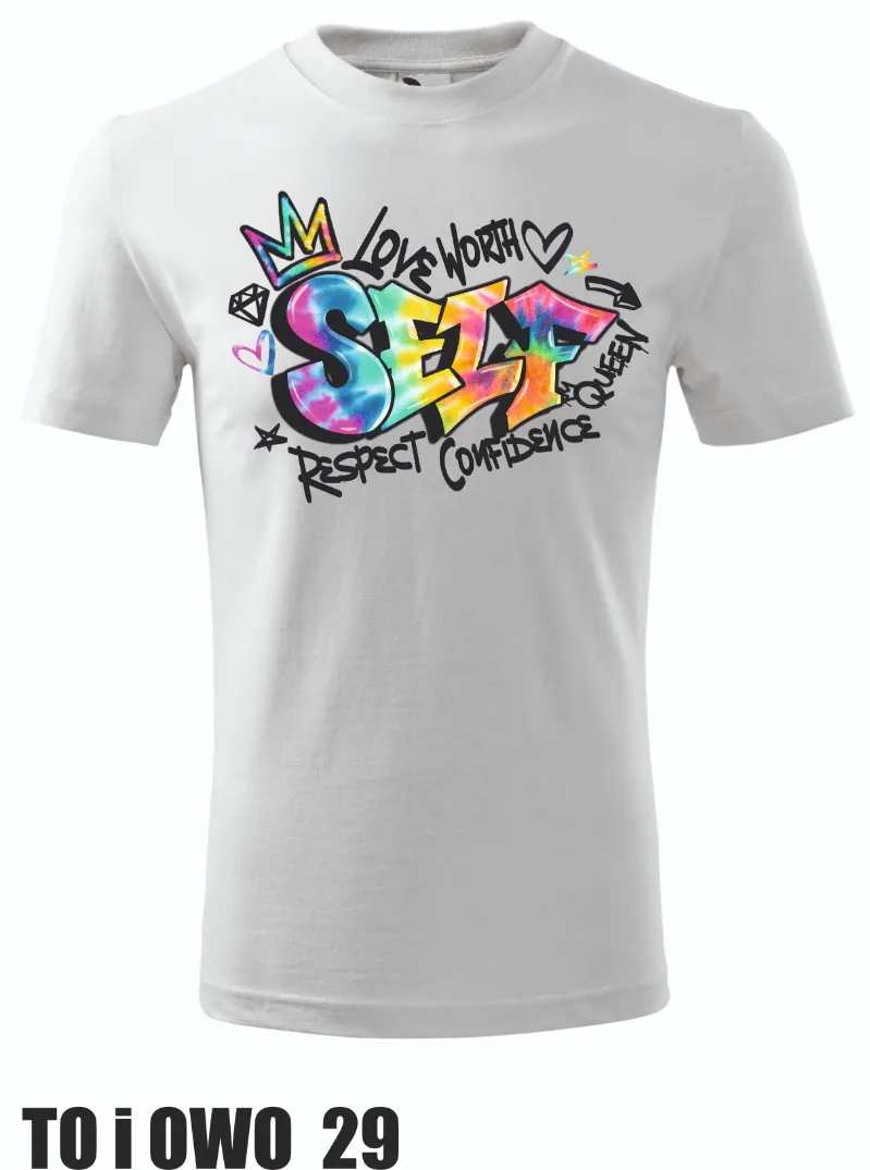 Koszulka z motywem graffiti, w którym słowo „SELF” jest wyróżnione kolorowymi, neonowymi barwami. Dookoła widoczne są słowa takie jak „Love”, „Respect”, „Confidence”, co dodaje koszulce motywacyjnego przekazu.