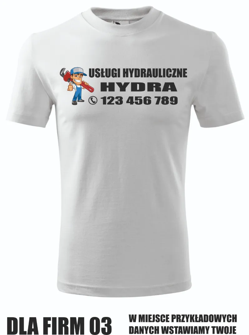Koszulka dla hydraulików. Wyrazista postać hydraulika z kluczem na tle napisu „Usługi Hydrauliczne”. Praktyczny numer kontaktowy wyróżnia się na jasnym tle, co sprawia, że łatwo zapamiętać firmę.