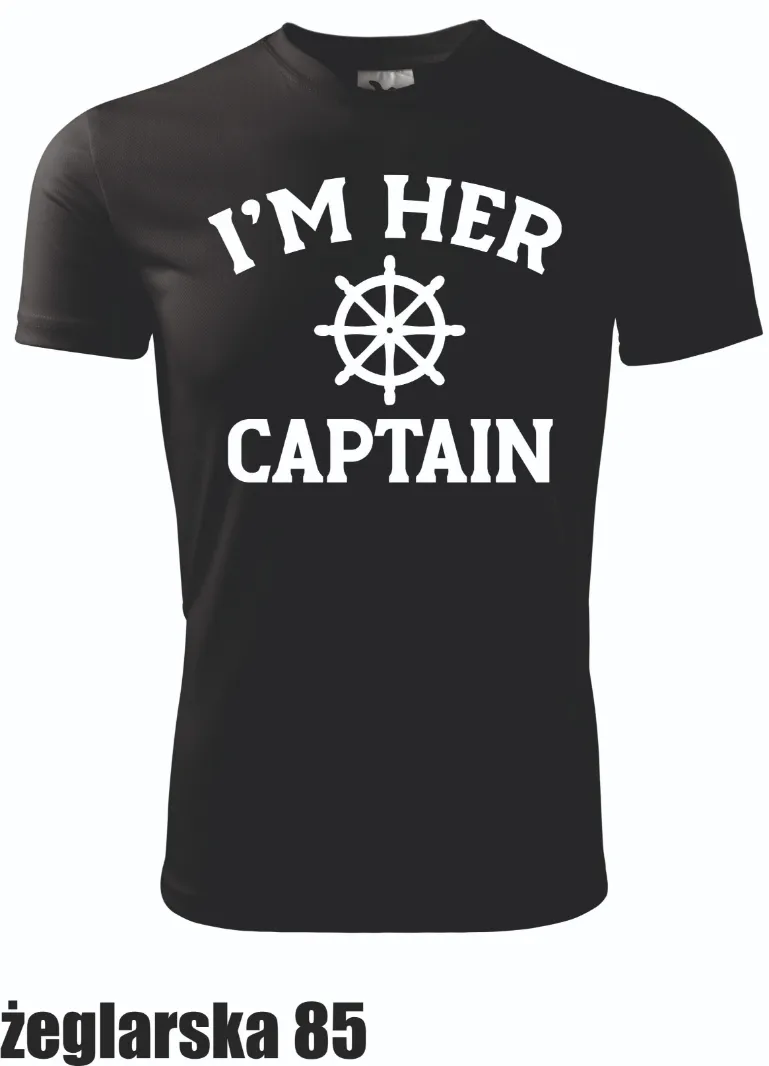 Koszulka z napisem „I’m Her Captain” i grafiką steru statku, nadająca się do zestawu z koszulkami żeglarskimi „I’m his anchor”. Klasyczny styl marynistyczny.
