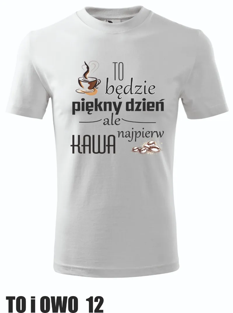 Koszulka z napisem „To będzie piękny dzień, ale najpierw kawa”. Idealna dla wszystkich miłośników kawy, którzy nie wyobrażają sobie poranka bez filiżanki ulubionego napoju.