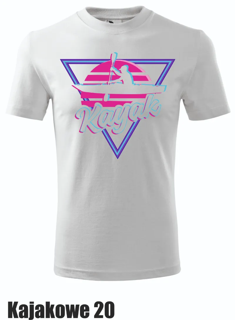 Stylowy retro wzór z pastelowymi odcieniami, doskonale oddający klimat lat 80. i zamiłowanie do kajakowania. Koszulka, która przenosi Cię w czasie, a jednocześnie podkreśla Twoją miłość do sportów wodnych.