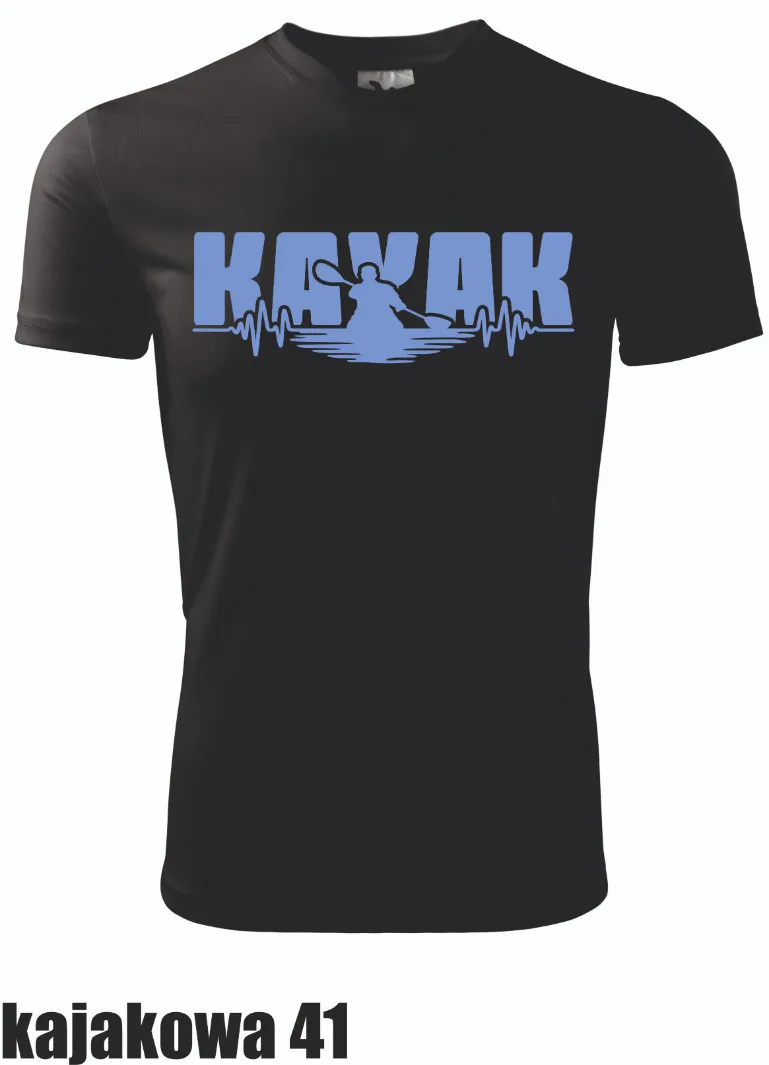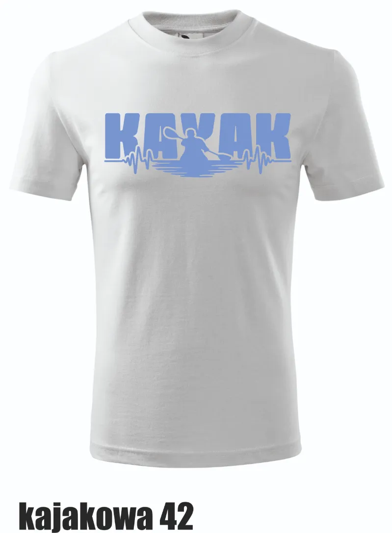 Koszulka z delikatnym, niebieskim nadrukiem „KAYAK” i postacią kajakarza. Symbolizuje harmonię i spokój płynący z natury.