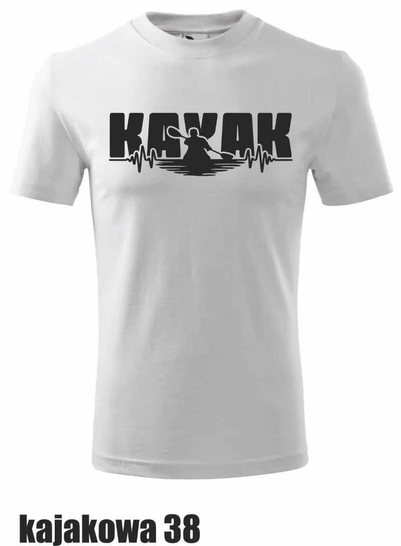 Koszulka z delikatnym, czarnym nadrukiem „KAYAK” i postacią kajakarza. Symbolizuje harmonię i spokój płynący z natury.