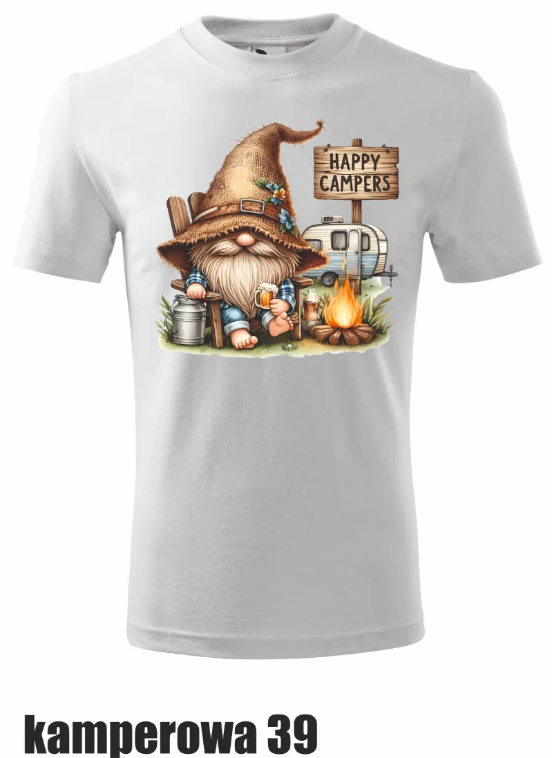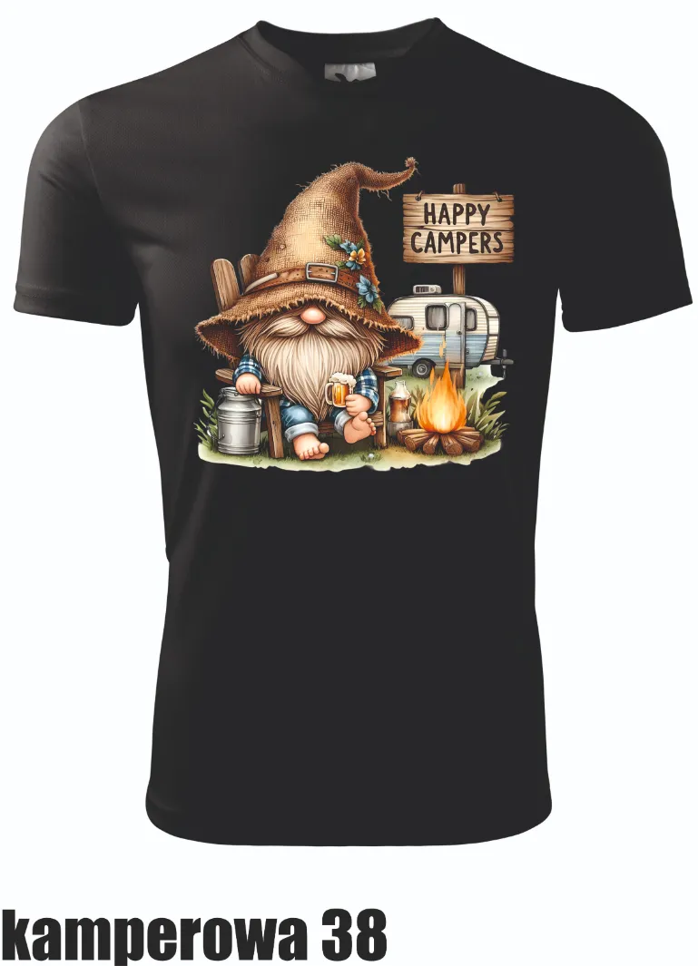 Czarna koszulka z krasnoludkiem i hasłem 'Happy Campers’, idealna dla każdego, kto ceni campingowy styl życia.