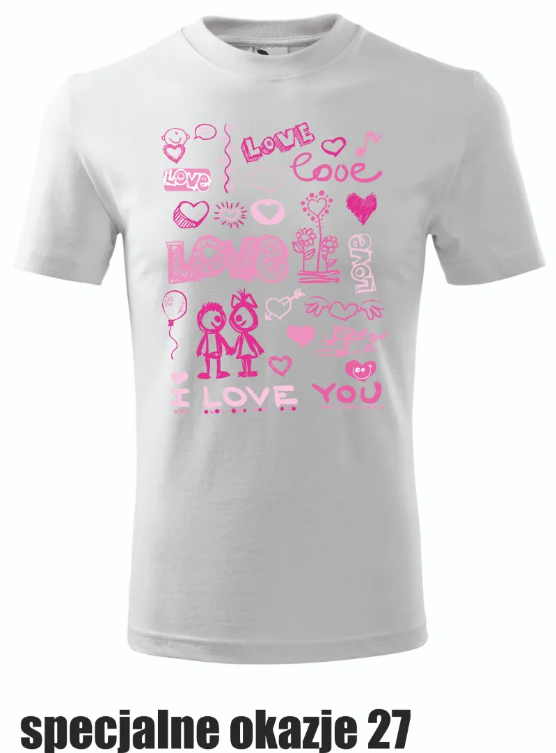 Romantyczna koszulka z różowymi elementami miłosnymi. Idealna na prezent dla ukochanej osoby.