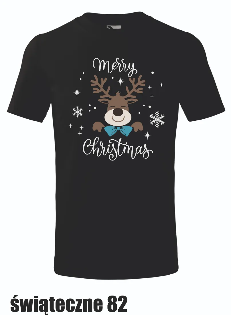 Subtelna i elegancka koszulka z motywem renifera w muszce, otoczonego śnieżynkami i gwiazdkami z napisem „Merry Christmas”. Idealny wybór na świąteczne spotkania, podkreślający styl i świąteczny klimat.