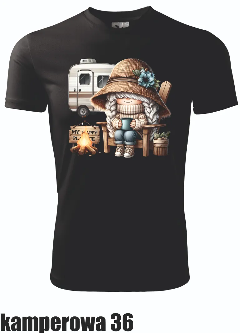 Koszulka z uroczą krasnoludką przy ognisku i napisem 'My Happy Place’ – dla tych, którzy kochają spokój i naturę.