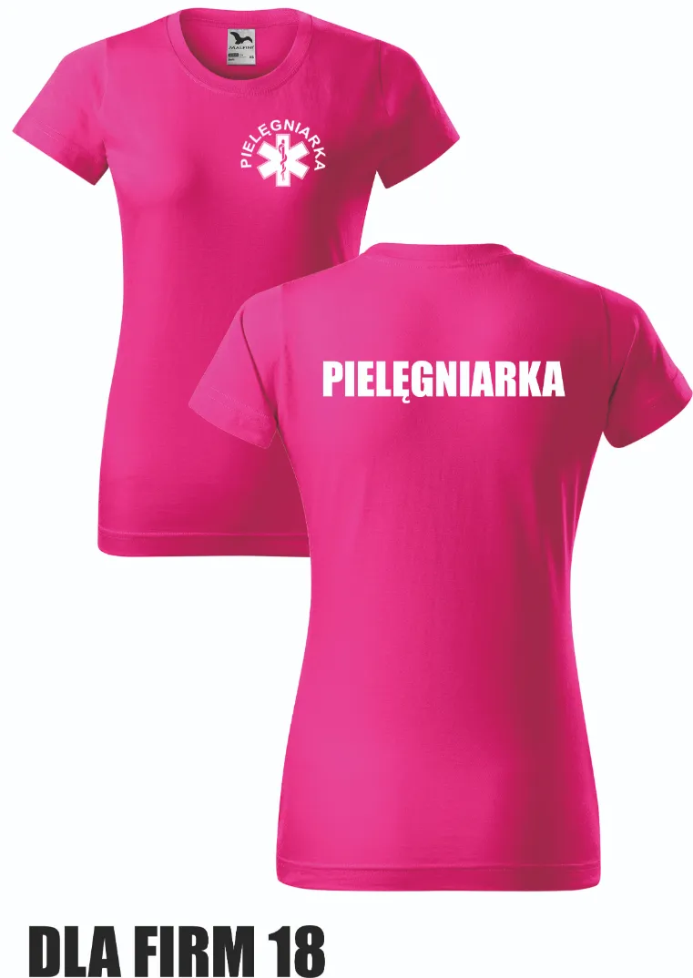 Koszulka „PIELĘGNIARKA”. Klasyczna koszulka z różowym tłem, oraz dużym napisem na plecach.