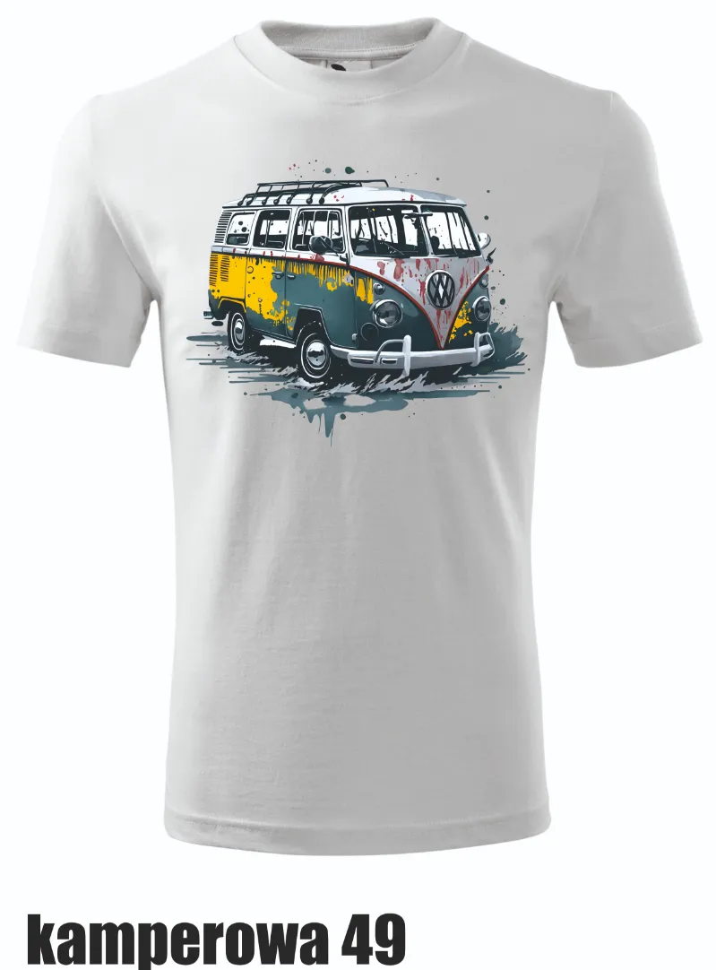 Kultowy Volkswagen T1 w artystycznej wersji, nawiązujący do czasów retro. Świetny wybór dla fanów klasycznych pojazdów i podróży kamperem.