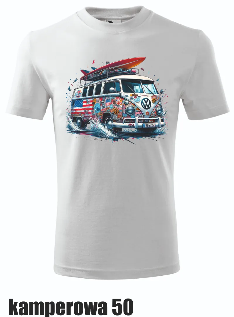 Barwny kamper z motywem surfingu, pełen energii i letnich wibracji. Koszulka idealna na wakacje i dla miłośników przygód na plaży.