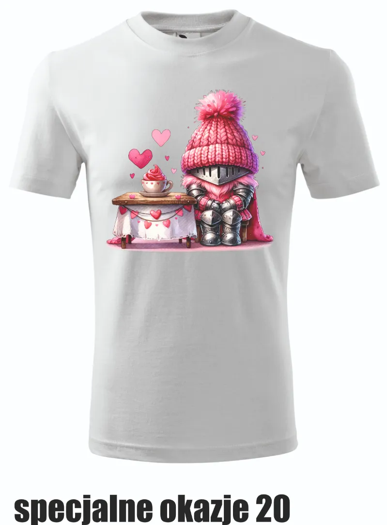 Przeuroczy rycerz w różowej czapce, siedzący przy stole z filiżanką herbaty i deserem, otoczony serduszkami. Koszulka doskonała dla osób, które cenią sobie romantyczny i humorystyczny klimat.