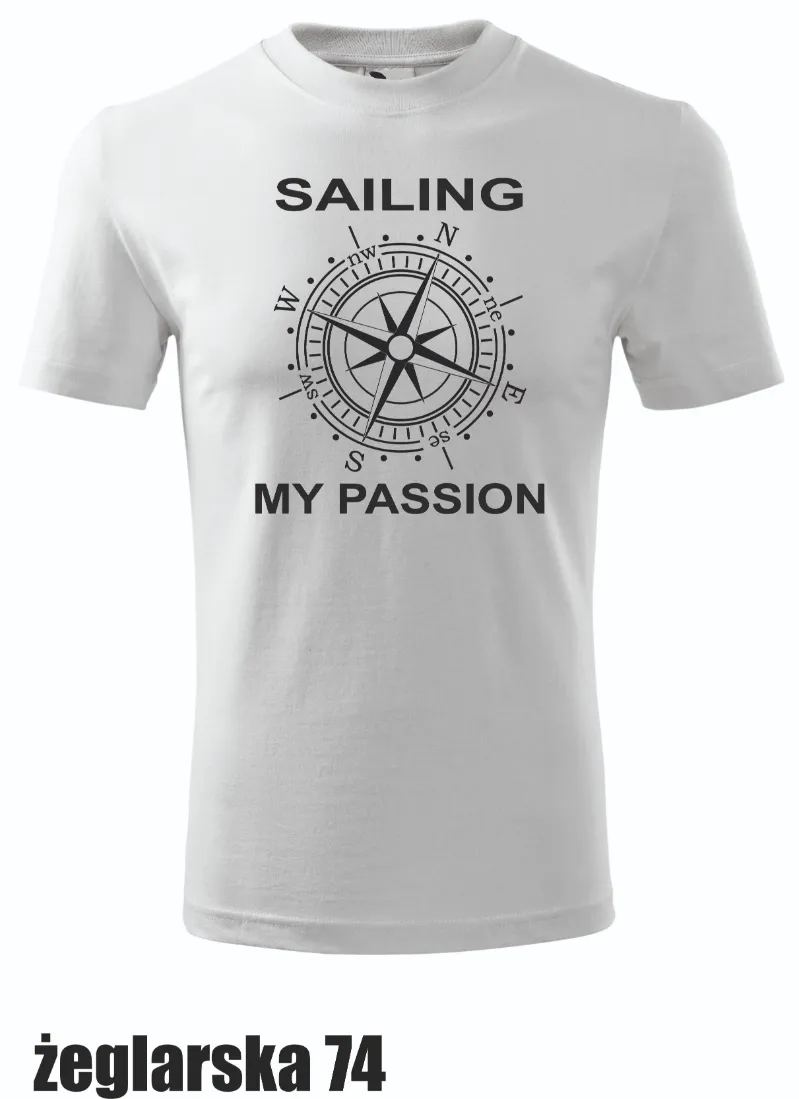 Koszulka z hasłem „Sailing My Passion” na tle kompasu. Marinistyczny motyw idealny dla fanów żeglarstwa.