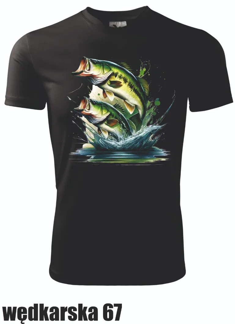 Koszulka z zielono-niebieskim motywem dwóch skaczących ryb, uderzających o taflę wody. Dynamiczny design, który idealnie sprawdzi się dla wędkarzy ceniących naturę.