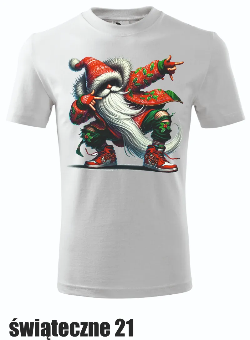 Ta koszulka przedstawia świętego Mikołaja w stylu street art! Z dynamiczną pozą i ręką ułożoną w znak pokoju, Mikołaj pokazuje, że jest gotów na współczesne święta. Idealna dla każdego, kto lubi nietypowe podejście do tradycji!
